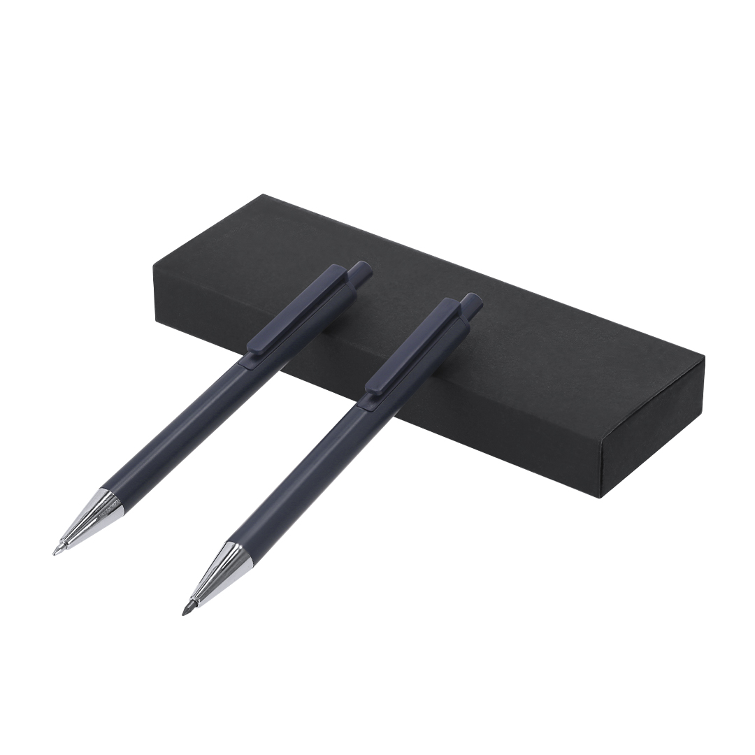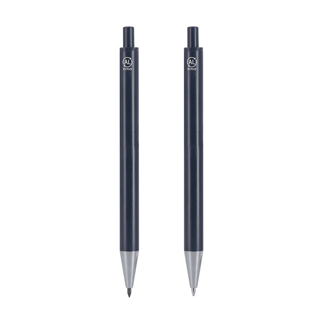 Set compuesto por un bolígrafo de tinta azul y un lápiz eterno, fabricados en Aluminio Reciclado. El lápiz eterno ofrece escritura continua, evitando generar residuos. Ambos cuentan con mecanismo pulsador. Diseñados con clip a juego y detalles cromados. Presentados en estuche de cartón reciclado de color negro. Con distintivo de AL Recycled impreso. Bolígrafo y Lápiz Eterno Aluminio Reciclado