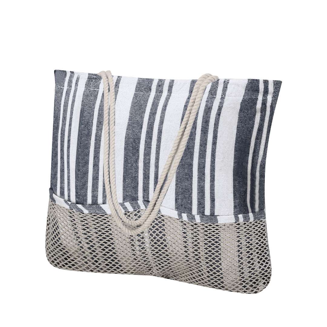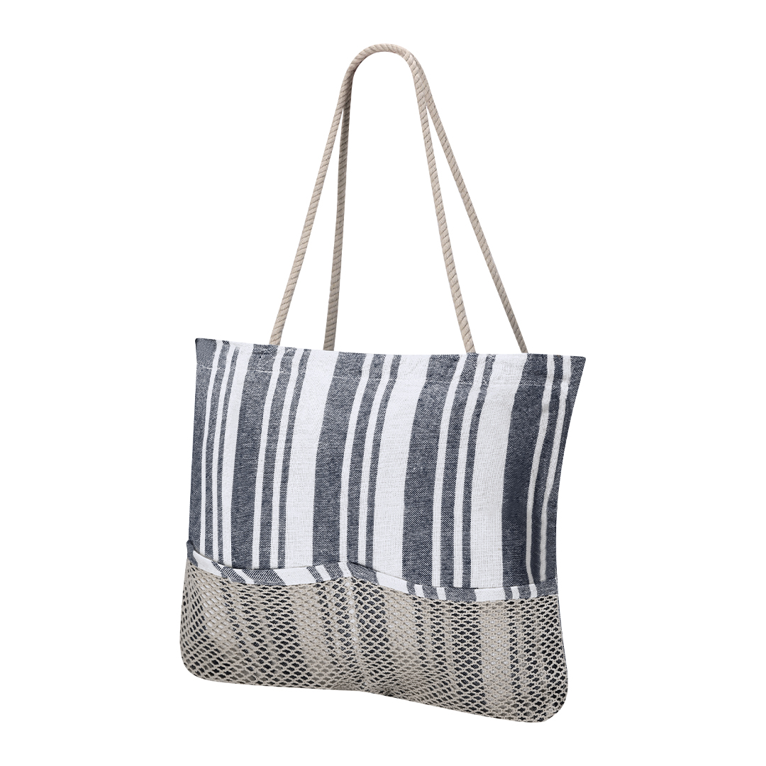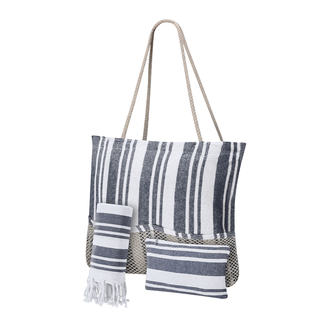 Set bolsa, neceser y pareo fabricado principalmente en algodón 180 g/m². Diseño de rayas con diferentes grosores. Ideal para escapadas vacacionales. Bolsa con 2 bolsillos frontales de malla, con fuelle y asas en cordón de algodón trenzado. Suave pareo en combinación. Su diseño cuenta con una base en color y rayas blancas a conjunto con la bolsa. Incluye flecos en los extremos que añaden un detalle decorativo y que completan su acabado.Neceser con compartimento principal de cierre de cremallera.   Bolsa, Neceser y Pareo   60% Algodón/ 40% Poliéster 180 g/ m2