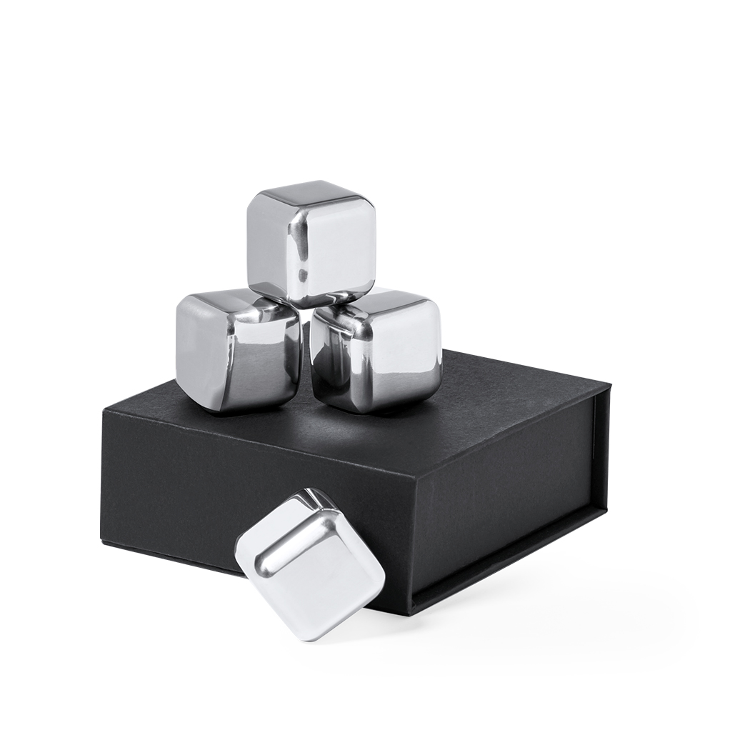 Set de 4 cubitos reutilizables. Fabricados en acero inoxidable, manteniendo la bebida fría sin alterar sus propiedades al no diluir su contenido en agua, además de mantener el sabor original de la misma. Presentados en elegante estuche color negro con interior troquelado. Reutilizable. 4 Piezas Acero Inox