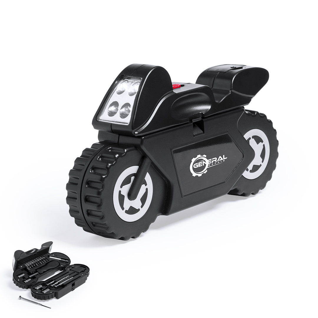 Set de herramientas de 14 accesorios en resistente estuche con diseño de moto, con linterna de 4 ledes integrada. Incluye set de destornilladores de precisión, herramienta de fijación, cabezales destornilladores planos y de estrella y llaves para tuercas de cabeza hexagonal. Pilas de botón incluidas. Presentado en caja individual. 4 Ledes. 21 Accesorios. Pilas Botón Incluidas