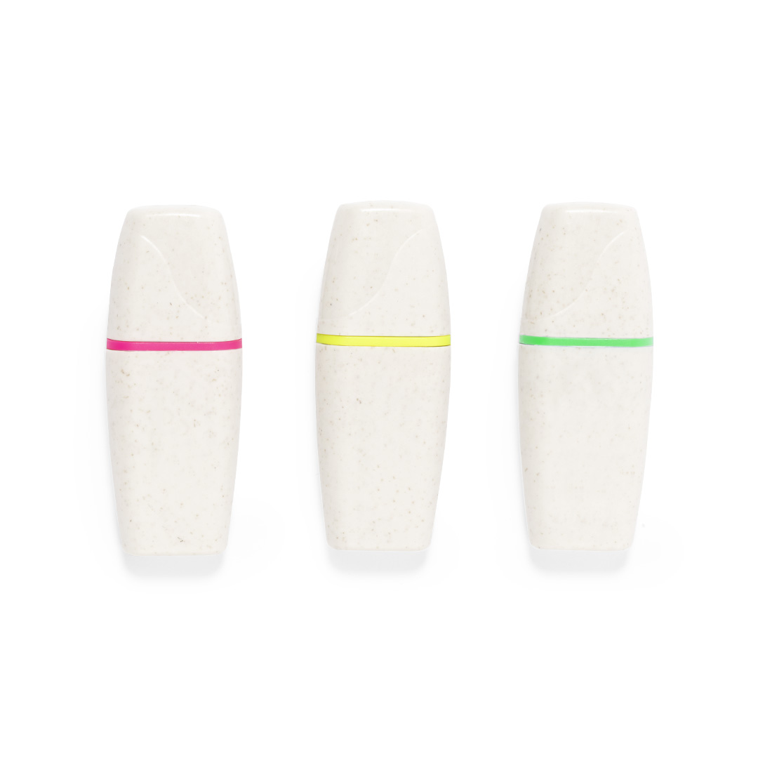 Original y práctico set de marcadores fluorescentes fabricados en caña de trigo y ABS. Incluye tres colores: amarillo, verde y rosa fluorescente. Presentados en bote con cuerpo transparente y tapa blanca a rosca, con superficie lisa para marcaje.La caña de trigo fomenta la utilización de materias primas naturales, reduciendo así las emisiones contaminantes. 3 Piezas Caña de Trigo/ ABS