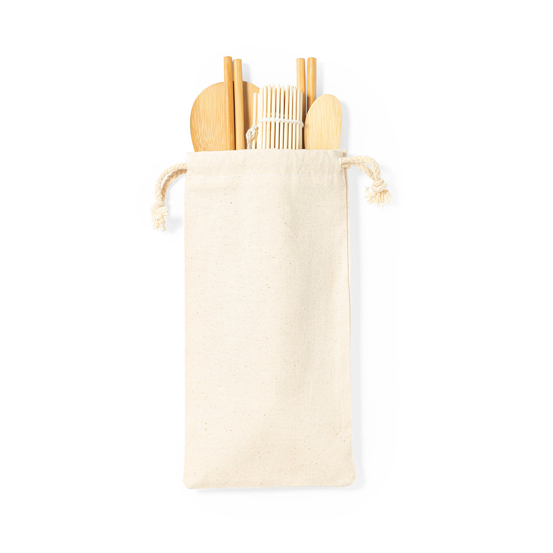 Set de sushi de 5 piezas fabricado en bambú natural. Compuesto por una estera de sushi, 2 juegos de palillos, una cuchara y cuchillo/paleta para el arroz. Incluye bolsa de algodón para fácil transporte y almacenaje. Presentado en caja individual de diseño eco en cartón kraft. 5 Piezas. Funda Algodón Bambú