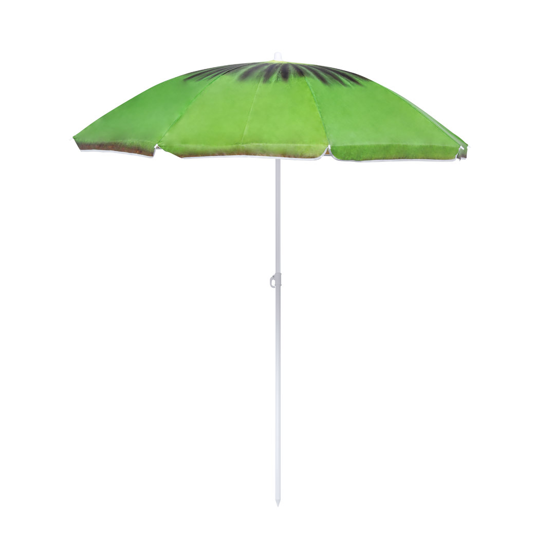 Colorida sombrilla de playa con diseños frutales. 150 cm de diámetro, con 8 paneles en resistente nylon y faldones laterales ribeteados. Tubos metalizados en color blanco y ajustable en altura. Presentada en funda transparente con cinta de transporte para hombro. Funda PVC Nylon
