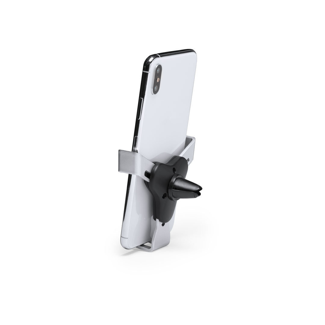 Ingenioso soporte para smartphone de diseño minimalista y especialmente diseñado para smartphones tamaño XXL. Con sistema de fijación universal que se activa por el propio peso del teléfono, ajustando las pinzas de agarre una vez que se sitúa el dispositivo en el soporte. Para rejilla de ventilación del automóvil y con frontal especialmente diseñado para marcaje en tampografía.   Ajustable