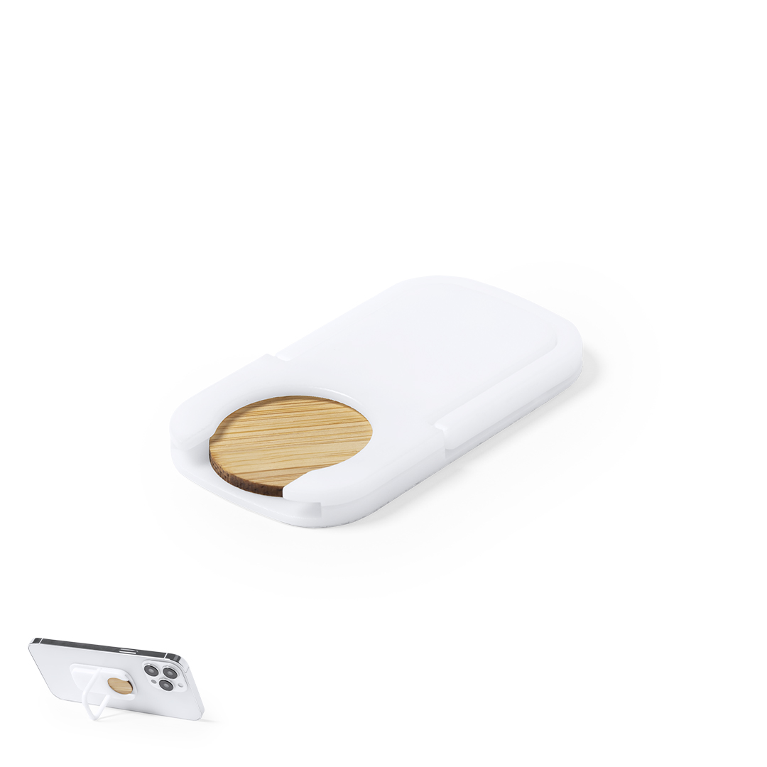 Soporte multifunción para smartphone, con moneda para carro de la compra integrada y anilla/soporte plegable. Cuerpo fabricado en resistente ABS de acabado blanco, con moneda en bambú. Con adhesivo de fijación extra fuerte y libre de residuos al despegarlo del dispositivo. Adhesivo. 3 Funciones Bambú/ ABS