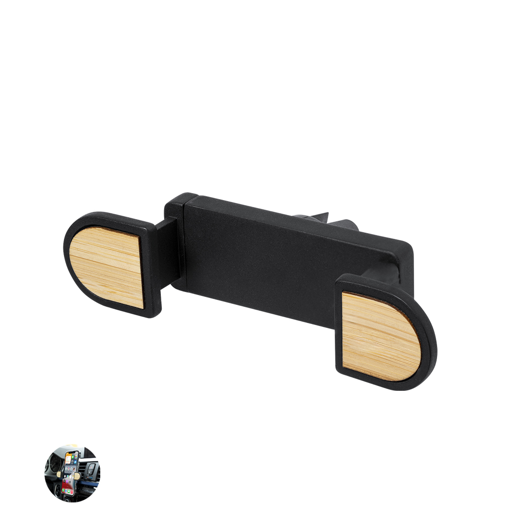 Soporte ajustable para smartphone de diseño minimalista, con base rotatoria 360º y de elegante acabado en color negro con detalles en bambú. Con sistema de fijación en rejilla de ventilación del automóvil y amplia superficie de marcaje, diseñado especialmente para tampografía. Presentado en caja de diseño kraft. Materiales como el bambú fomentan la utilización de materias primas naturales, reduciendo las emisiones contaminantes. Proviene de una planta de gran resistencia y versatilidad, con crecimiento y regeneración rápidos, siendo una excelente alternativa al uso de madera tradicional. Ajustable ABS/ Bambú