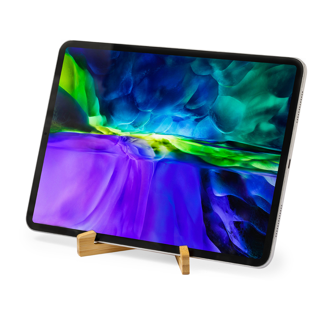 Soporte plegable para dispositivo móvil fabricado en resistente bambú. Con patas ajustables y presentado individualmente en bolsa de papel reciclado. Materiales como el bambú fomentan la utilización de materias primas naturales, reduciendo las emisiones contaminantes. Proviene de una planta de gran resistencia y versatilidad, con crecimiento y regeneración rápidos, siendo una excelente alternativa al uso de madera tradicional. Bambú
