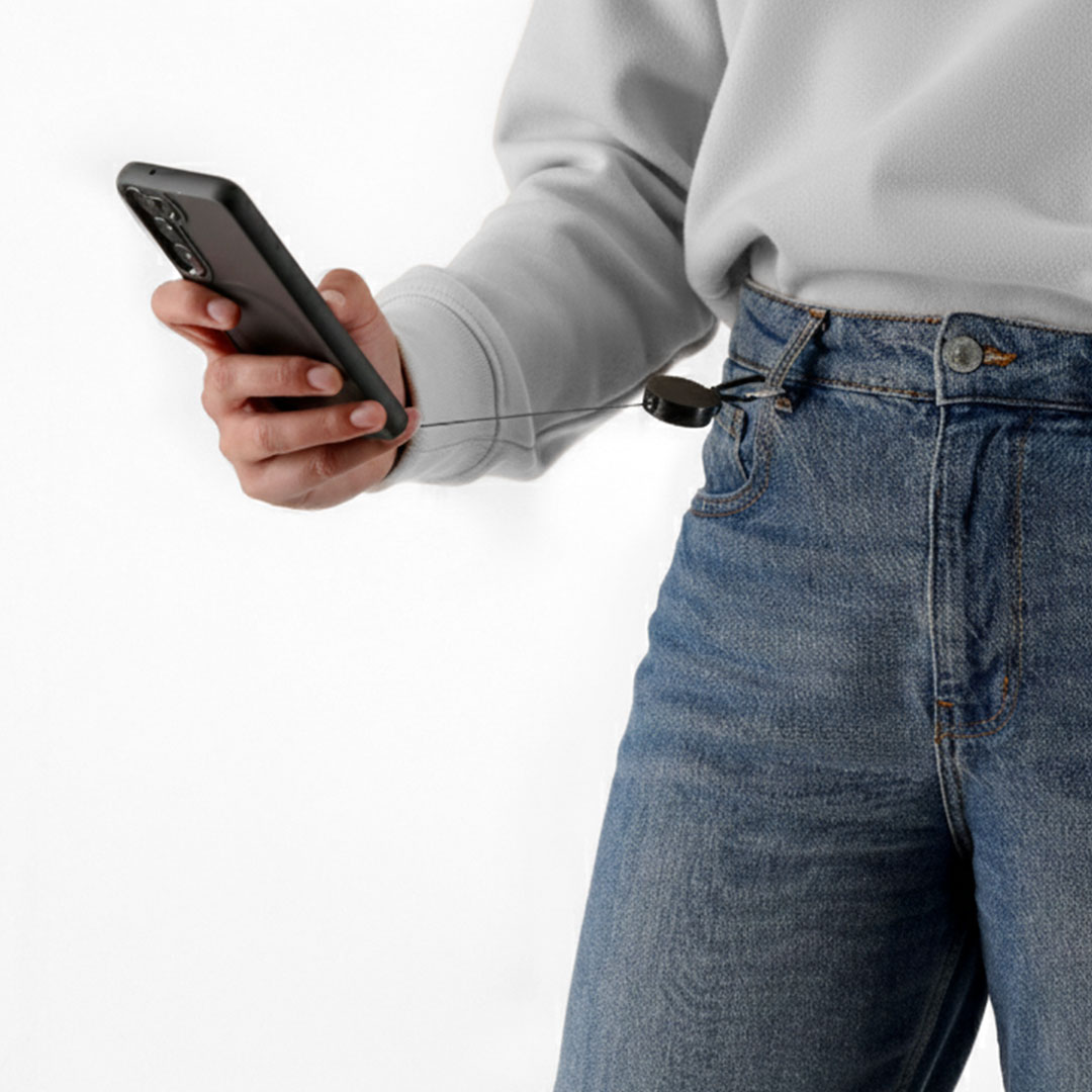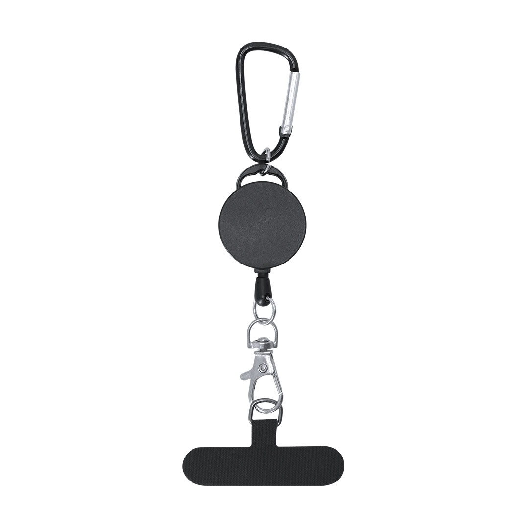 Soporte extensible de 60 cm para smartphone. Accesorio de transporte para situar entre la funda y el smartphone y mosquetón giratorio metálico. Incluye un mosquetón en el extremo para colgar y poder transportar con facilidad. Extensible