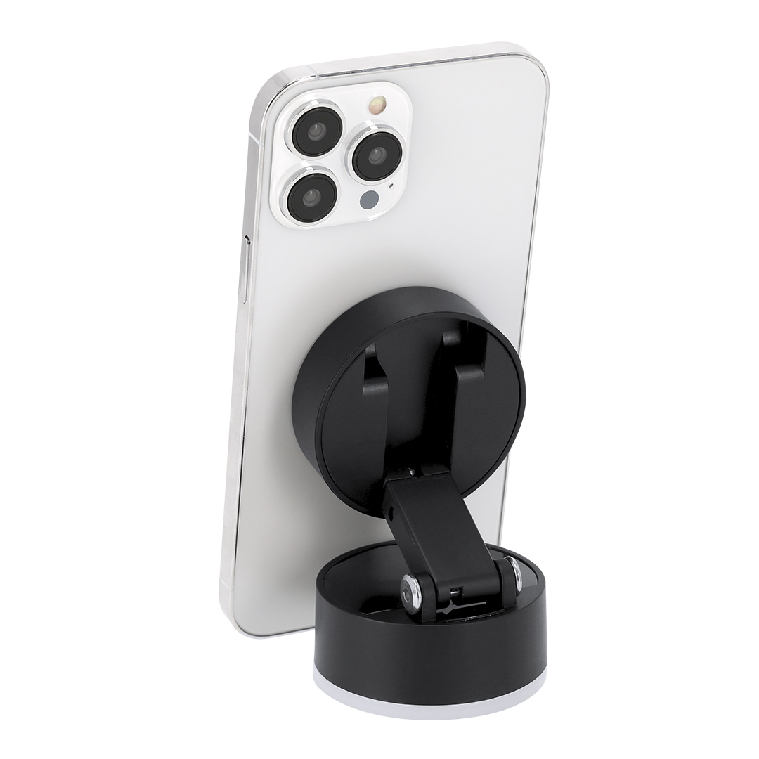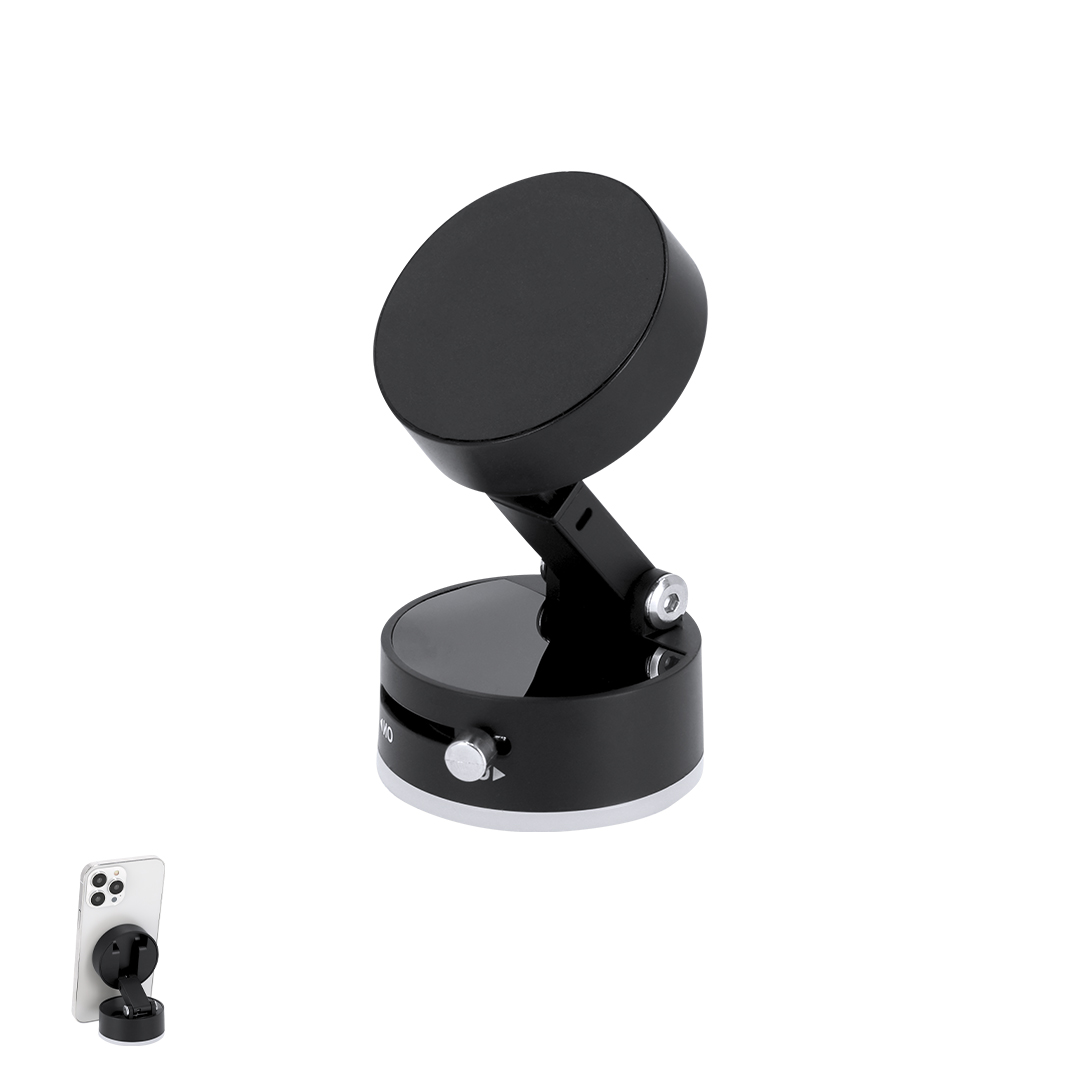 Soporte magnético para teléfono en ABS. Sujeción a través de ventosa con botón de activar/desactivar ON/OFF. Incluye anillo metálico magnético . Dispone de un soporte retráctil ajustable, ideal como solución para asegurar tu dispositivo de forma estable y versátil en cualquier superficie.   Magnético y Ventosa. Plegable. Altura y Ángulo Regulable