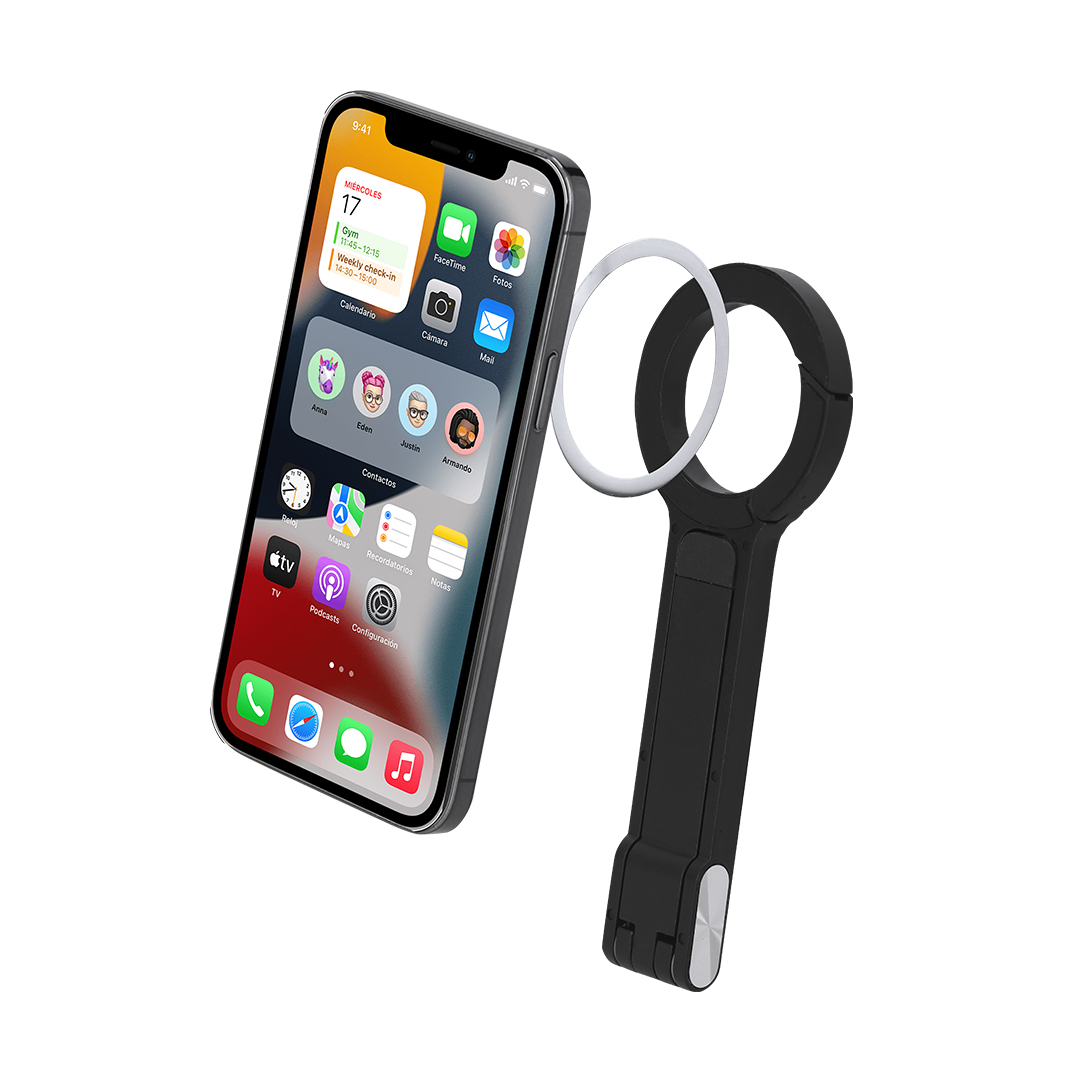 Soporte multifuncional magnético plegable fabricado en resistente ABS en acabado mate. Con base desplegable para graduar altura. En la parte superior dispone de enganche mosquetón para fácil transporte. Magnético. Plegable