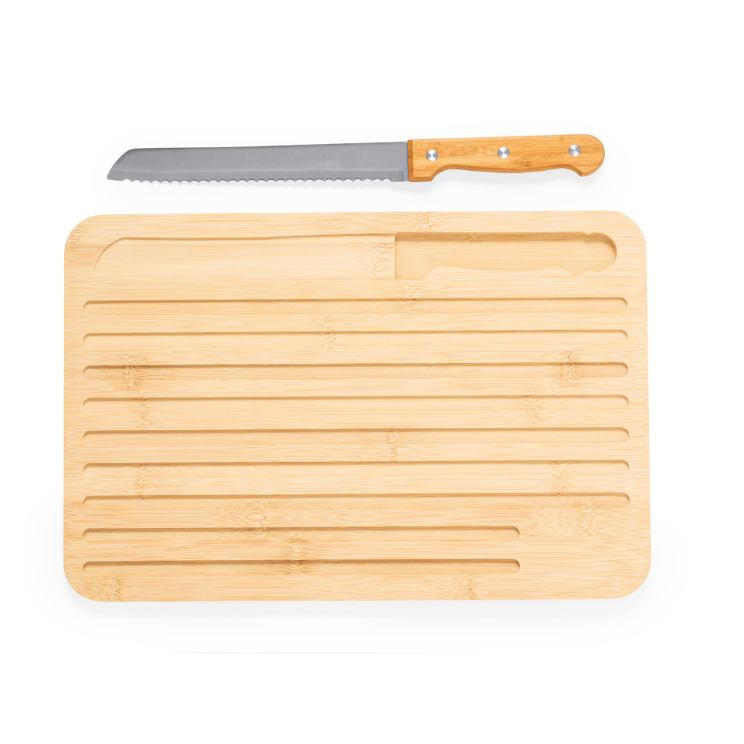 Tabla de cocina fabricada en bambú, acompañada de un cuchillo. Su cara lisa permite diversas aplicaciones, mientras que la otra presenta surcos grabados en la madera, ideal para cortar pan o alimentos jugosos. Incluye un compartimento con un cuchillo de sierra de hoja de acero y mango en bambú. Materiales como el bambú fomentan la utilización de materias primas naturales, reduciendo las emisiones contaminantes. Proviene de una planta de gran resistencia y versatilidad, con crecimiento y regeneración rápidos, siendo una excelente alternativa al uso de madera tradicional. Cuchillo Acero Inox/ Bambú Incluido Bambú