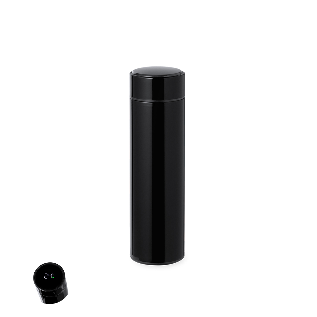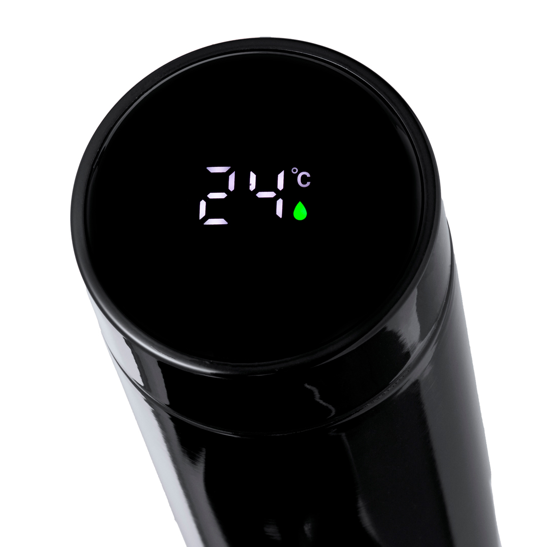 Termo en alta calidad de doble pared y 450 ml de capacidad, con medidor de temperatura táctil integrado en tapón. Fabricado en acero inox, que ofrece una resistencia y durabilidad excepcionales. Tapón en acero inox con infusor integrado y libre de BPA. Alimentación a pilas (de botón incluida), con manual de instrucciones en español e inglés. Disponible en variada gama de colores y presentado en atractiva caja de diseño kraft. 450 ml. Medidor Temperatura Táctil. Infusor Incluido. Pila Botón Incluida Acero Inox