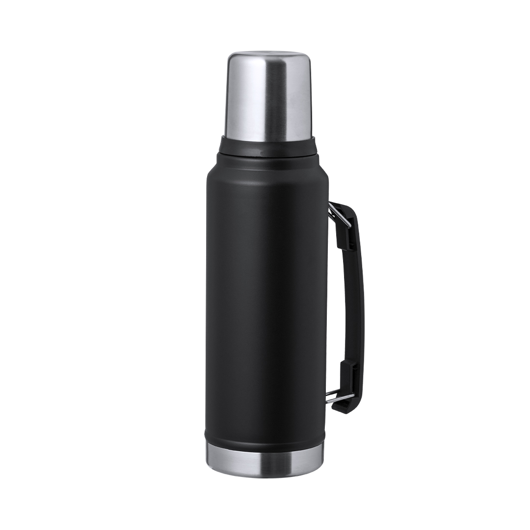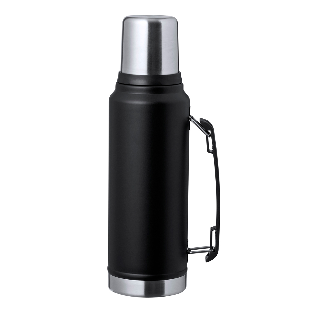 Termo de acero inox de 1L de capacidad. Combinación de color negro con acero pulido de elegante acabado, de cierre de rosca con tapón en forma de vaso de 200 ml y asa en el lateral para un fácil transporte. Presentado en caja de diseño kraft. 1 L. Vaso 200 ml Acero Inox