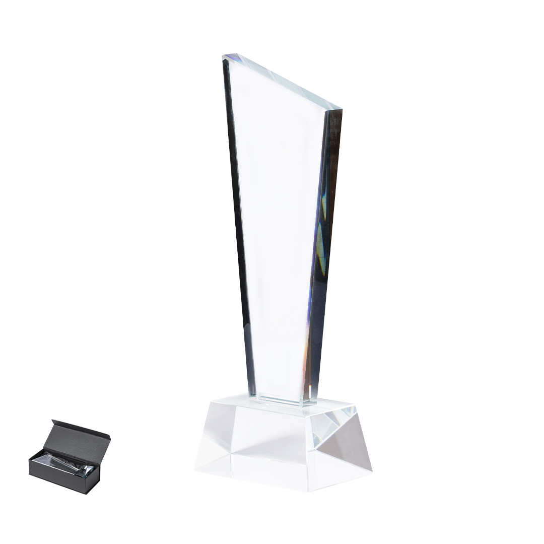 Trofeo de grueso cristal con original diseño y resistente base. Especialmente diseñado para marcaje a láser y presentado en estuche de protección en resistente cartón y cierre magnético, con interior troquelado en espuma. Cristal