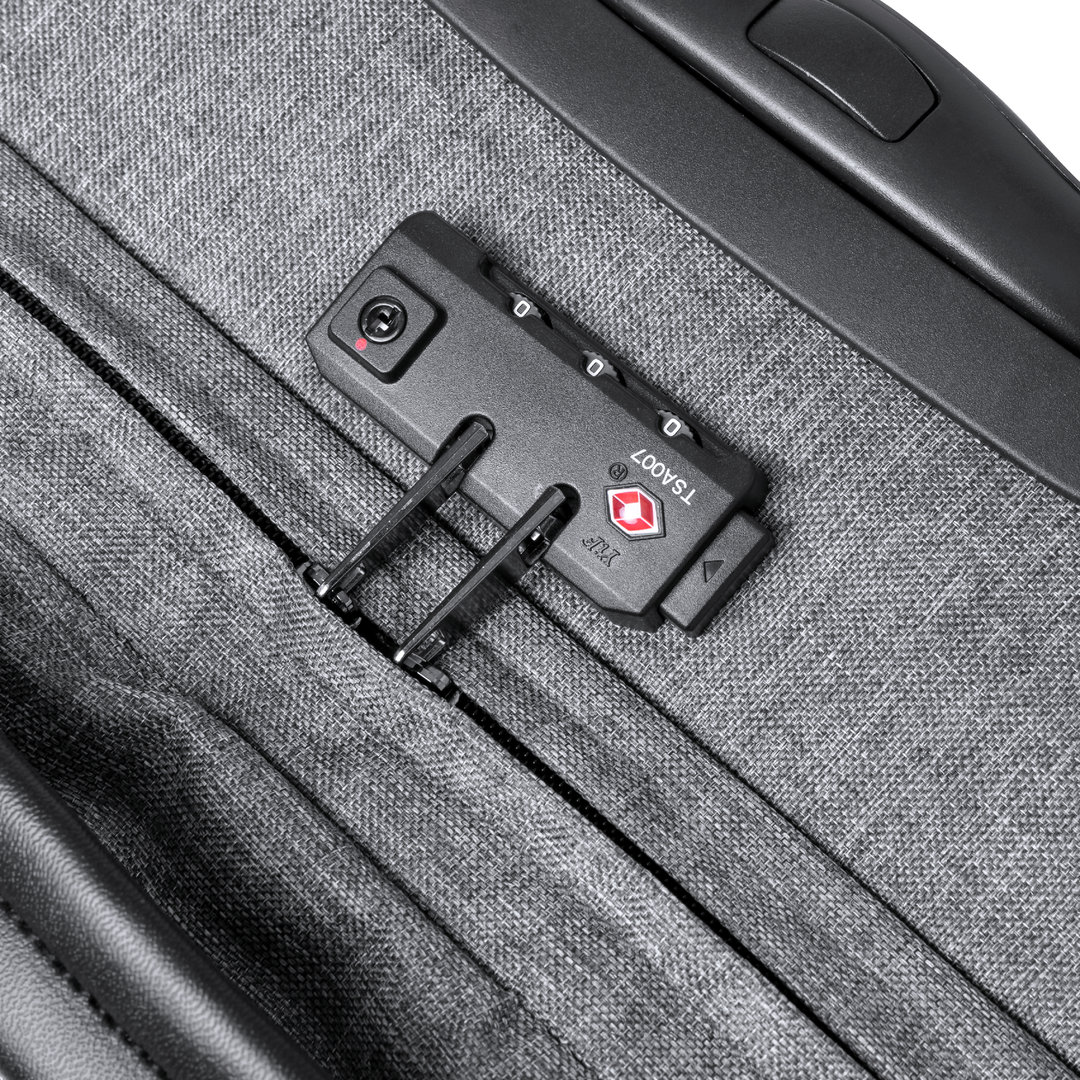 Trolley de línea nature fabricado en resistente 300D RPET. Compartimento principal con cierre de cremallera de doble tirador conforme a los estándares TSA -Administración de la Seguridad en el Transporte-, que permite a las autoridades de aduanas inspeccionar el contenido del equipaje sin tener que forzar o romper el cierre, usando una llave especial a disposición de la autoridad. Interior forrado y con cintas elásticas de sujeción. Exterior con 2 cintas ajustables, cierres de hebilla, bolsillo frontal con cierre de cremallera invisible y 2 asas acolchadas de transporte. Mecanismo extensible metálico en negro, con cómoda asa de transporte y 2 ruedas. Distintivo RPET en etiqueta exterior. Cierre Seguridad TSA Poliéster 300D RPET