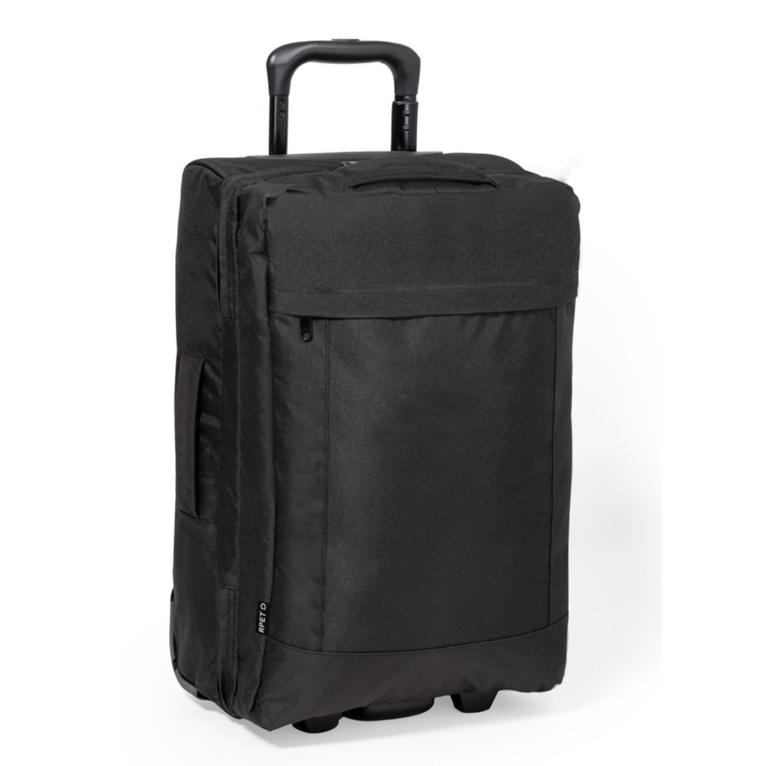 Trolley fabricado en resistente 600D RPET. Compartimento principal con cierre de cremallera de doble tirador conforme a los estándares TSA -Administración de la Seguridad en el Transporte-, que permite a las autoridades de aduanas inspeccionar el contenido del equipaje sin tener que forzar o romper el cierre, usando una llave especial a disposición de la autoridad.Interior forrado además de organizador en la zona central. Exterior con bolsillo frontal con cierre de cremallera invisible y 2 asas acolchadas de transporte. Mecanismo extensible metálico en negro, con cómoda asa de transporte y 2 ruedas. Logotipo RPET en etiqueta exterior.El material RPET se elabora a partir de plástico reciclado, para así fomentar la reutilización de residuos plásticos y ayudar a la sostenibilidad del planeta. Cierre Seguridad TSA Poliéster 600D RPET