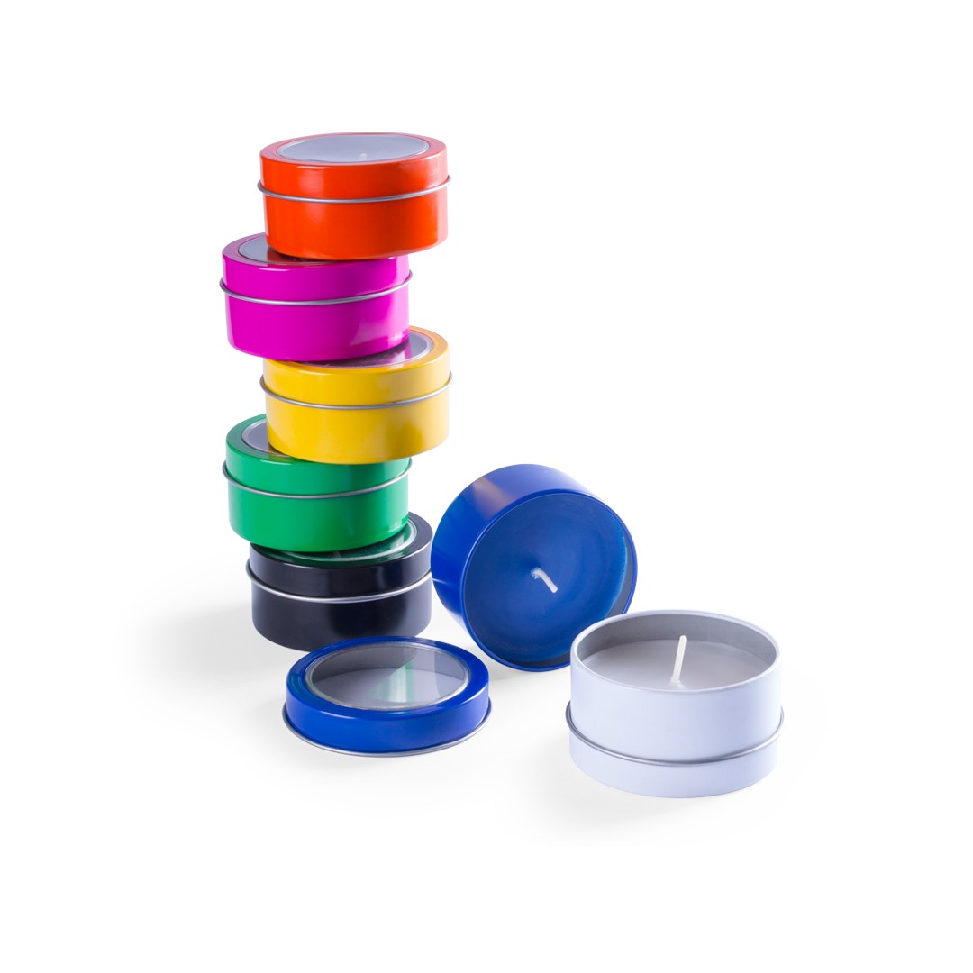 Vela aromática de fragancia vainilla presentada en original tarro metálico con ventana transparente en variada gama de vivos colores. Aroma Vainilla Metal